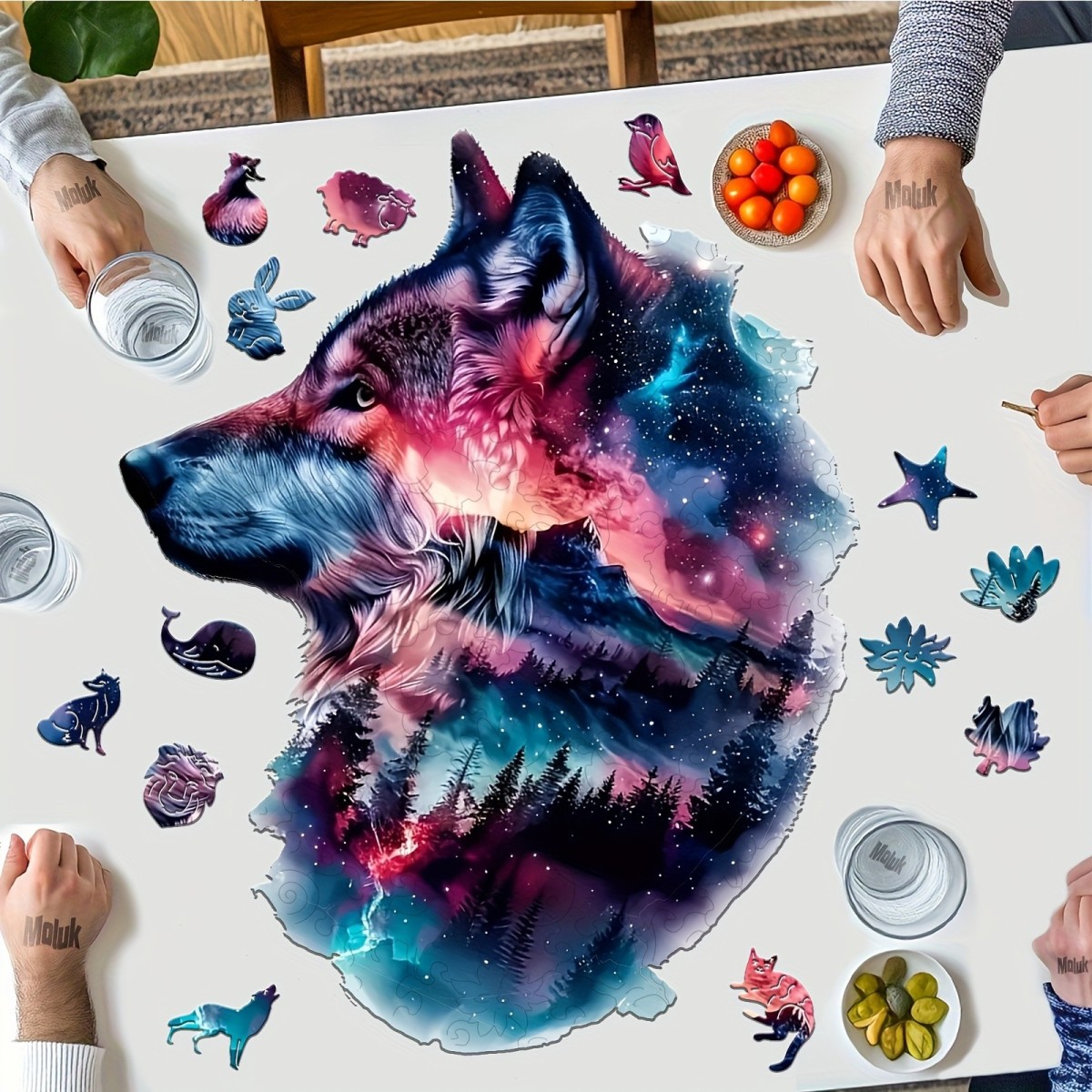 Design: Artistic wolf illustration with animal-shaped puzzle pieces.