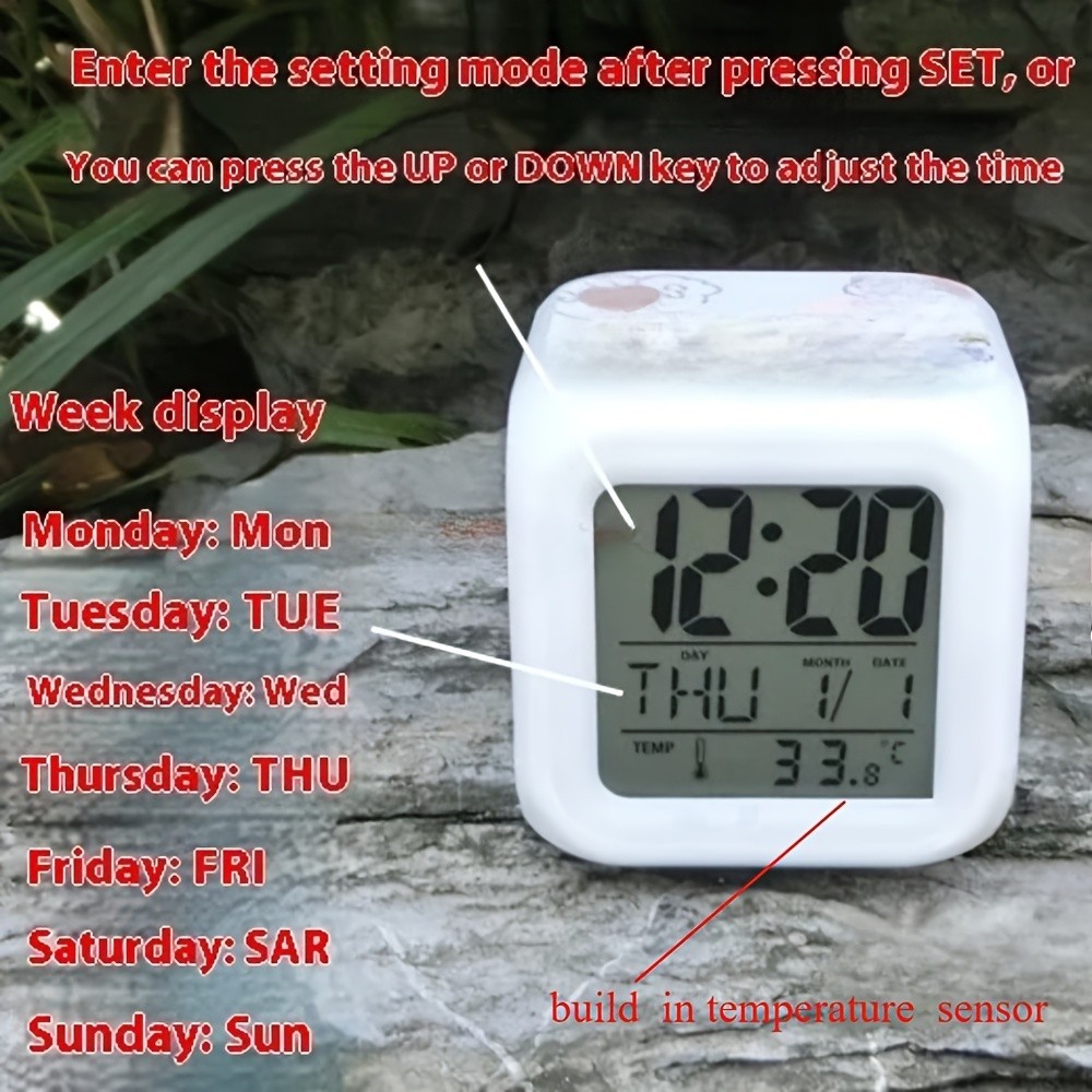 The colourful Stitch-themed design gives the clock a playful and friendly appearance. The LED-lit body can cycle through seven light tones, creating a soft night-light effect in the evening. Its lightweight, cube-shaped construction makes it easy to place on a bedside table, desk or shelf.