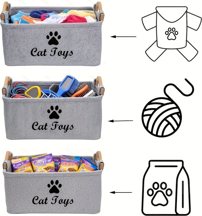 The cat toy storage basket is a practical, space-saving organizer designed to keep your pet’s toys, grooming tools or treats neatly in one place. Its open-top design allows for quick and easy access to items, making it suitable for everyday use at home. The basket is made from sturdy, flexible fabric that holds its shape well and is comfortable to carry.