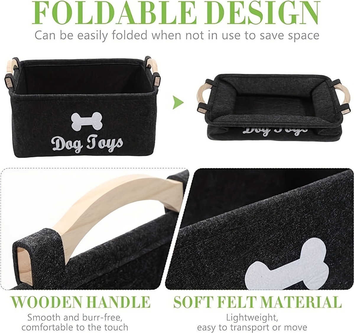 Made from sturdy yet flexible fabric, it holds its shape well and is easy to move around. The side handles provide comfortable lifting, while the neutral grey colour and paw-print design complement various interior styles. The basket measures approximately 38 × 25 × 18 cm (based on product images), offering plenty of space for toys, accessories and other dog-related items.