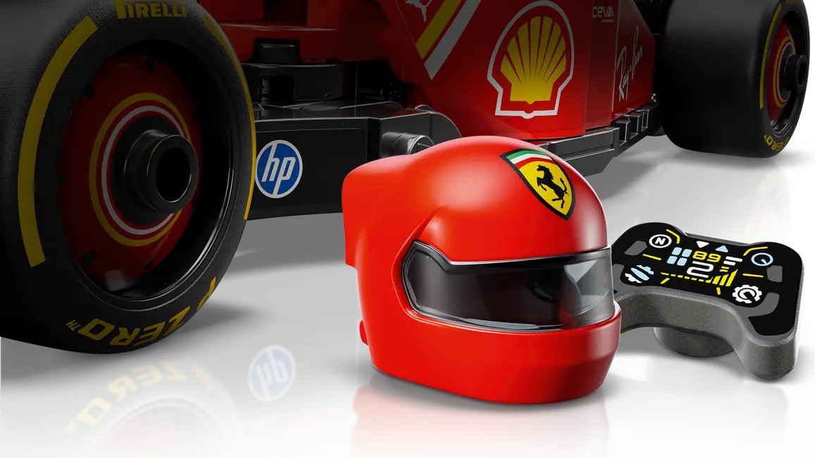 The F1 model car features a cockpit that opens by lifting the halo bar, a rear wing, wishbone suspension, sponsor stickers and wider rear tires imprinted with “Pirelli.” The F1 race car also comes with a driver minifigure wearing a Ferrari outfit and a winged helmet to place inside the cockpit and stage races.