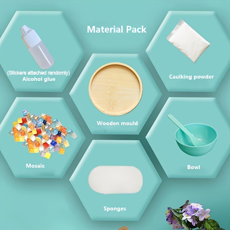 Komplektā: bambusa paliktnis, mozaīkas gabaliņi, šuvju masa, sūkļu komplekts, trauciņš maisīšanai
